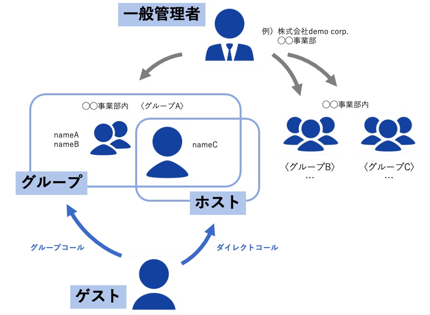 利用する立場ごとに「一般管理者(管理者)」「ゲスト」「ホスト」の権限があり、使用できる機能に違いがあります。また、権限とは別にホストを個別の「グループ」に所属させ管理することもできます。各権限の構成は次の通りです。
